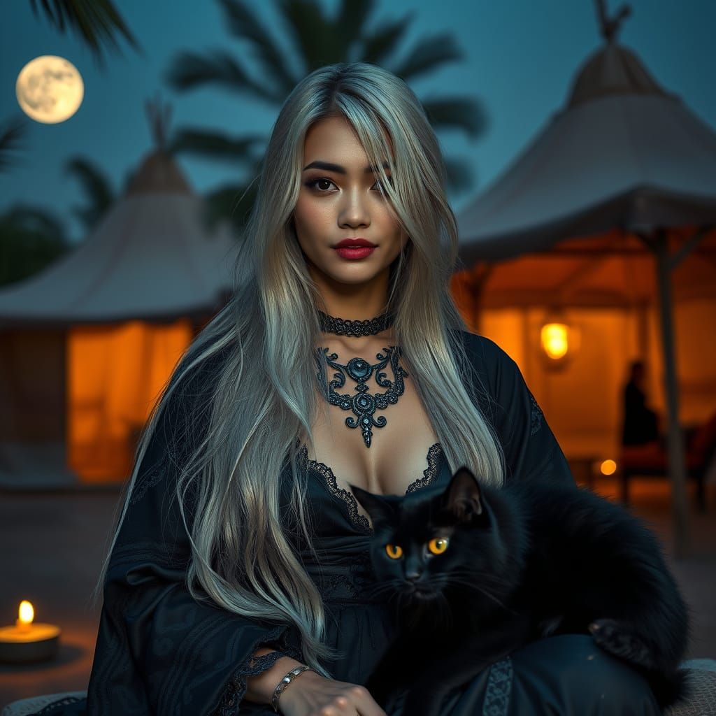 portrait artistique, photographique et hyperréalisme d'une très belle esclave chinoise aux longs cheveux noirs et à la peau laiteuse ornée de marques tribales. Elle est assise dans une oasis orientale merveilleuse, avec des tentes bédouines, des palmiers. Elle est éclairée par un feu de bois. Elle ...