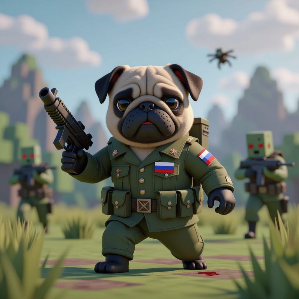 This image shows a pug in a military uniform with Russian flag patches, battling zombies in a detailed Minecraft world. Features 3D game cinematic graphics and dynamic lighting.