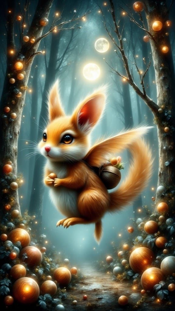 This image shows a flying squirrel with a backpack full of nuts, set against a misty forest with towering trees, fireflies, and a full moon. The squirrel's fur is intricately detailed, and its eyes are soulful and shining. The artwork combines vibrant colors with intricate textures and patterns, evoking ...