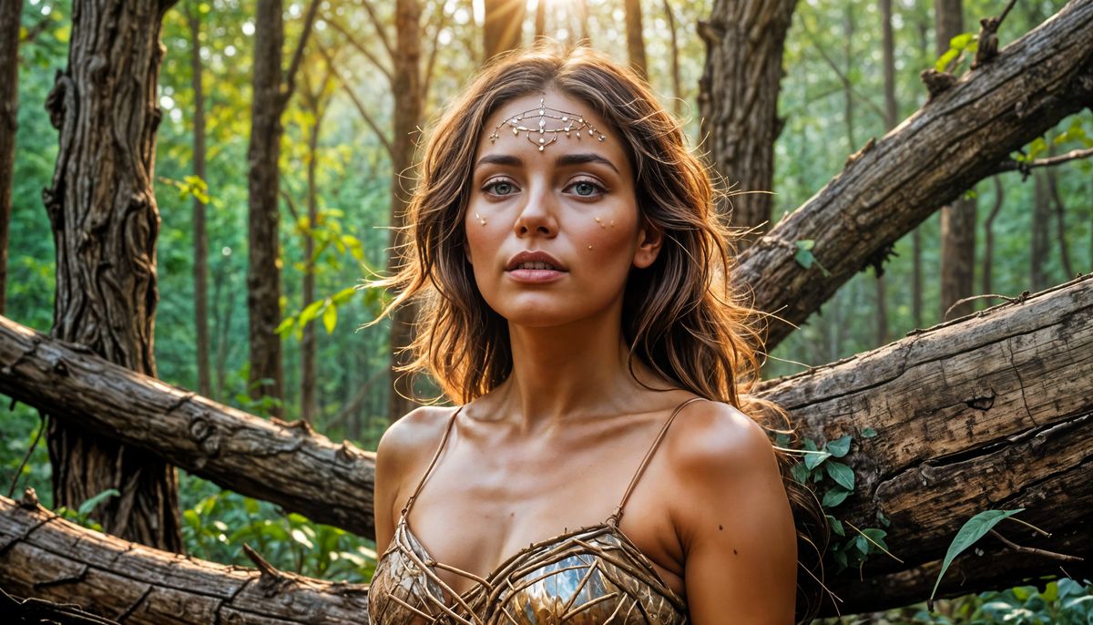This image shows a beautiful woman with brown hair and makeup, wearing a brown outfit. She is sitting on a log in a forest with thick trees and a stream of water, rendered as cosmic mixed media art.