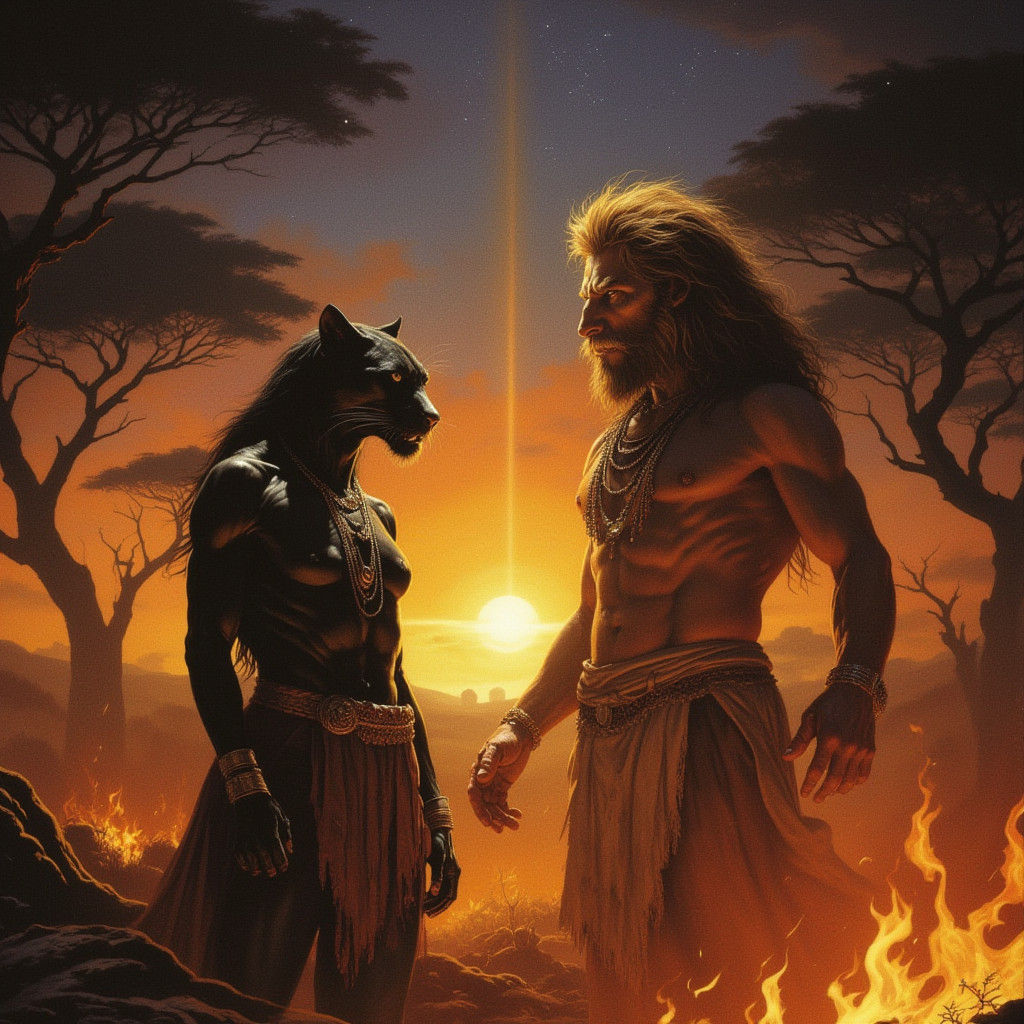 This image shows a panther-human hybrid smiling at a lion-human hybrid shaman against a savanna backdrop. Warm, golden light and cinematic techniques enhance the epic drama, reminiscent of a film still.
