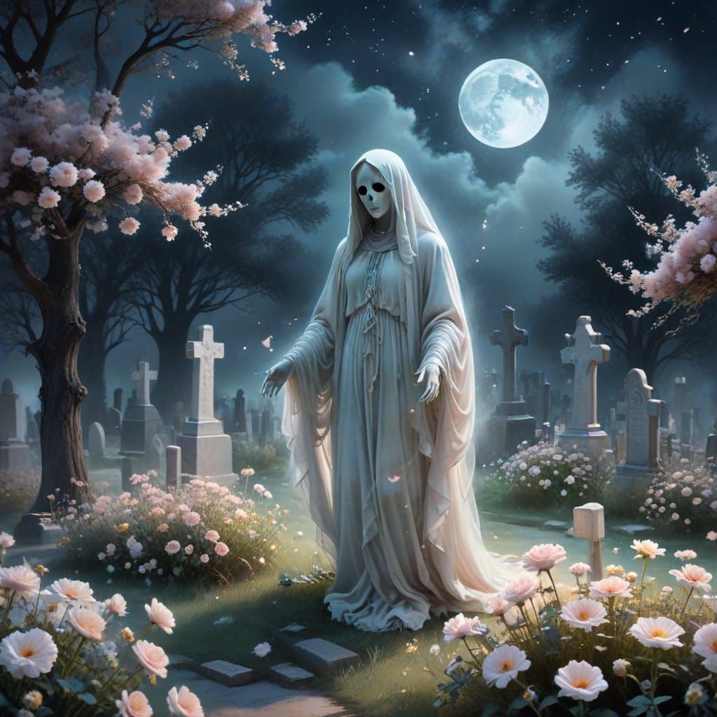 A semi-realistic illustration of a ghost drifting through a pastel cemetery at night, surrounded by luminous flowers under a glowing moonlit mist. Rendered in a dreamy watercolor style.