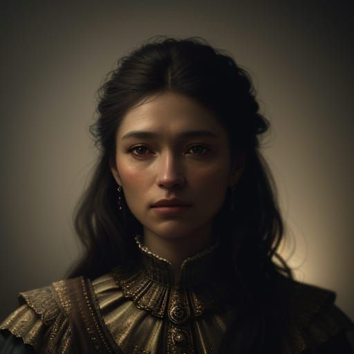 This image shows a close-up, medium shot of a woman bathed in soft, warm light. The hyperrealistic cinematic still features rich colors, intricate textures, and high contrast for a moody, atmospheric effect.