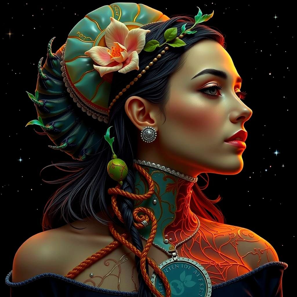 This image shows a woman with dark hair against a cosmic backdrop. She wears a silver medal and a jasmine blossom, surrounded by vibrant flames and fractal patterns.
