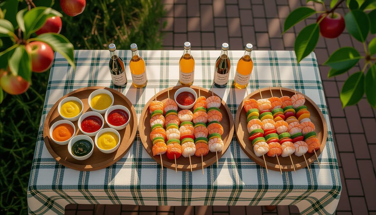This photorealistic image captures a delightful overhead view of grilled seafood skewers and sauces on wooden platters, set on a Victorian plaid tablecloth amidst apple trees. Soft lighting enhances vibrant colors for a joyful rural feel.