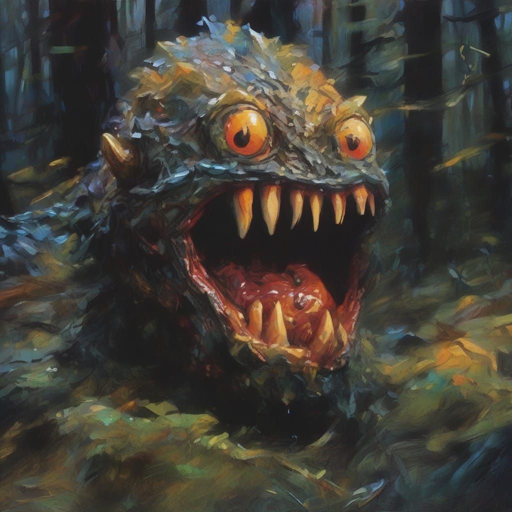 This image shows a surreal, close-up view of a monster in a dark forest, rendered in a gouache style. It features thick brush strokes, vibrant watercolor textures, and golden hour lighting.