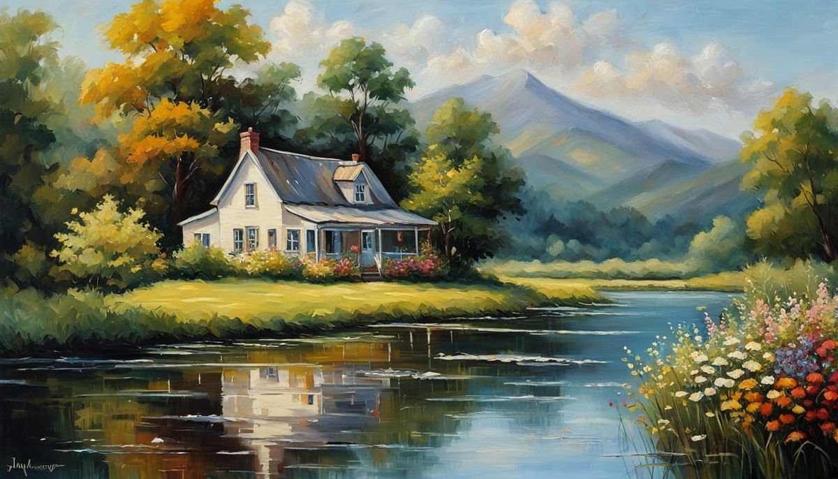 This image captures a serene scene of a charming cottage nestled by a serene river, surrounded by lush greenery and vibrant wildflowers, in soft focus with impressionist flair and realistic textures.