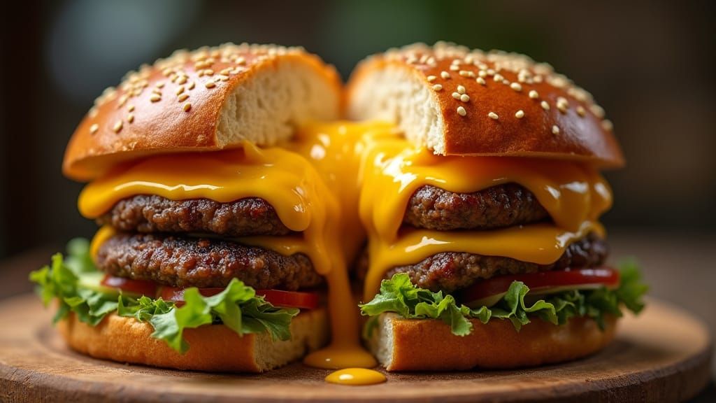 This image shows a burger cut in half with melting cheese. The patty glistens, nestled in a buttery brioche bun with amplified textures, illuminated by side lighting to showcase the cheese's flow.