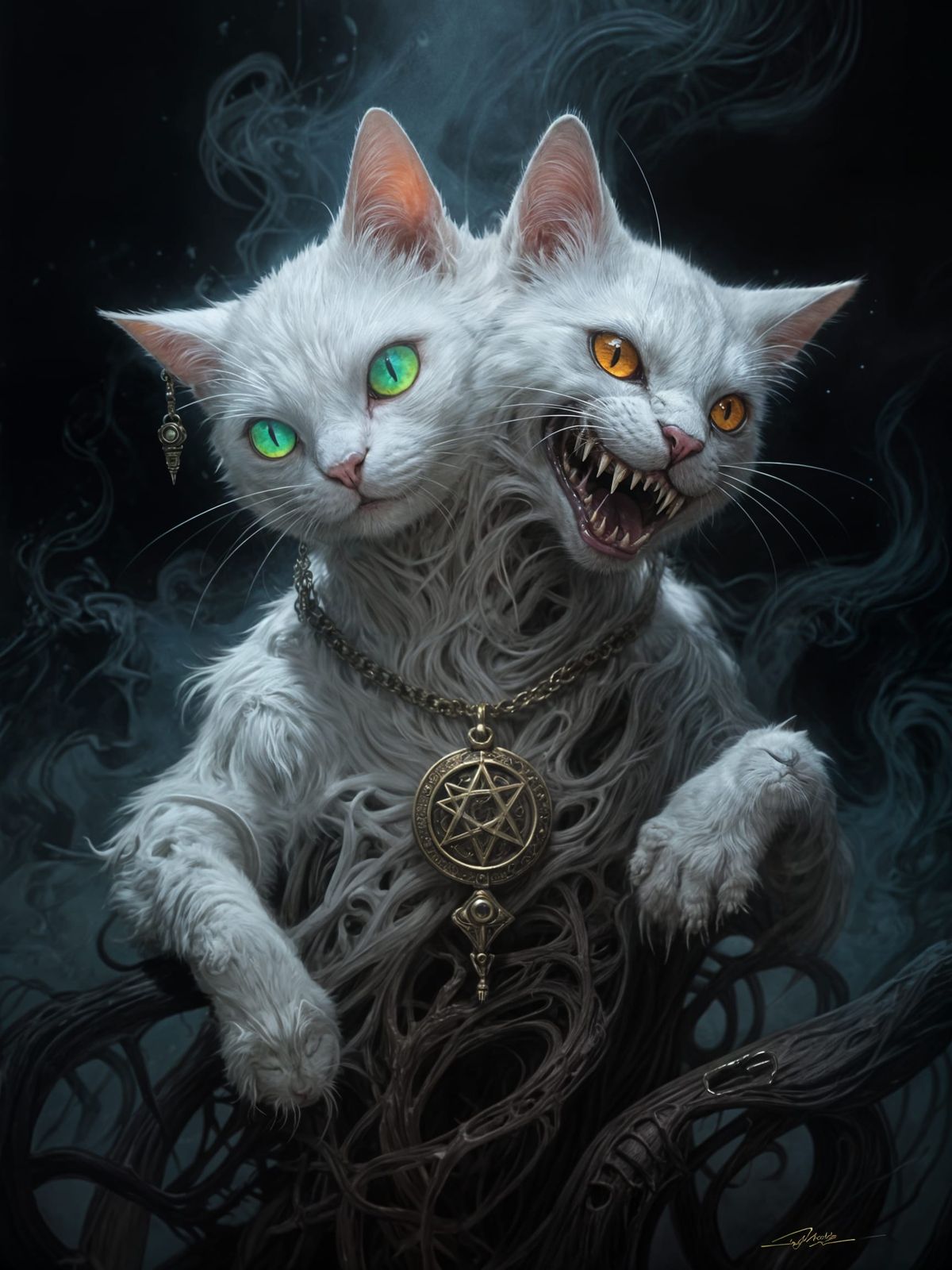 A surreal image of a white, two-headed cat with glowing, mismatched eyes and an occult amulet, set against a smoky background with dynamic shadows. Created in a chaotic, unsettling style with high detail.