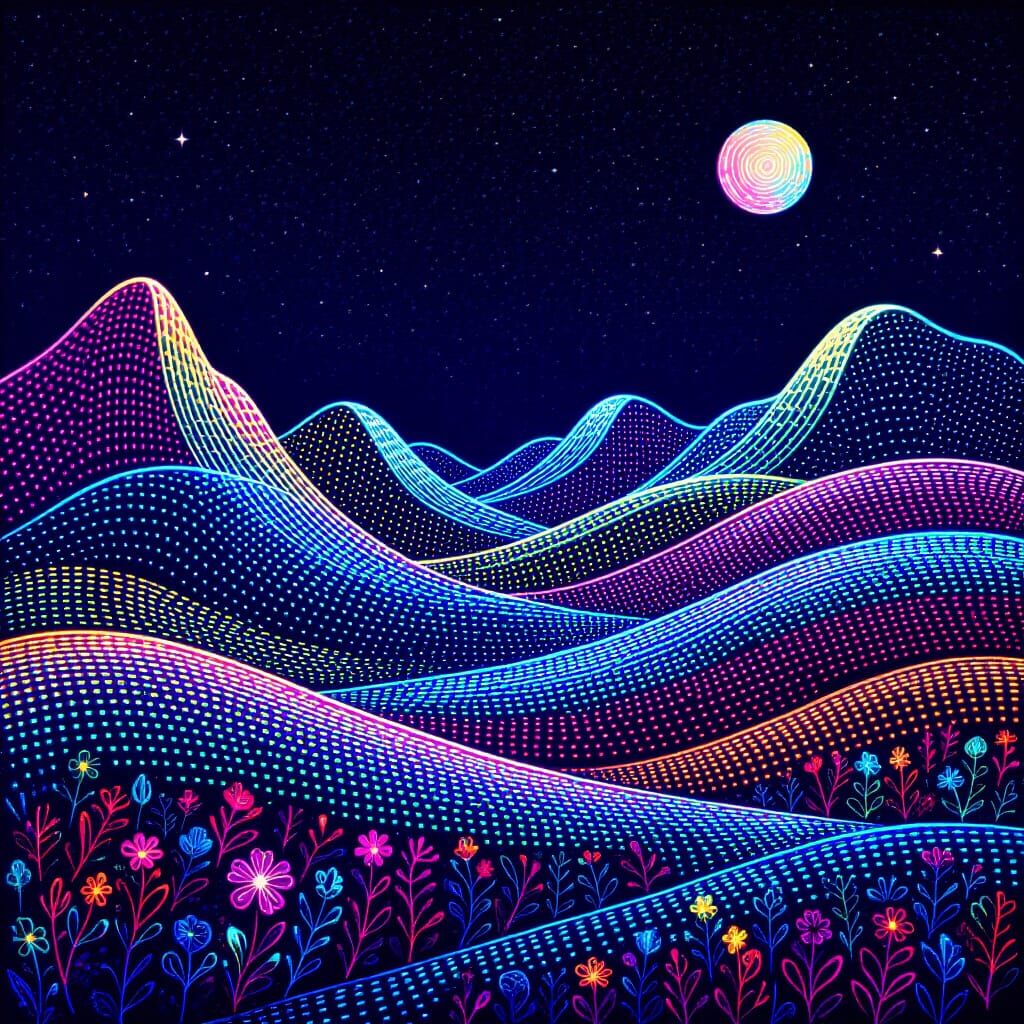 A captivating image of a holographic pixelscape. This artwork features luminous, embroidered details with a vibrant and surreal aesthetic, reminiscent of light painting techniques.