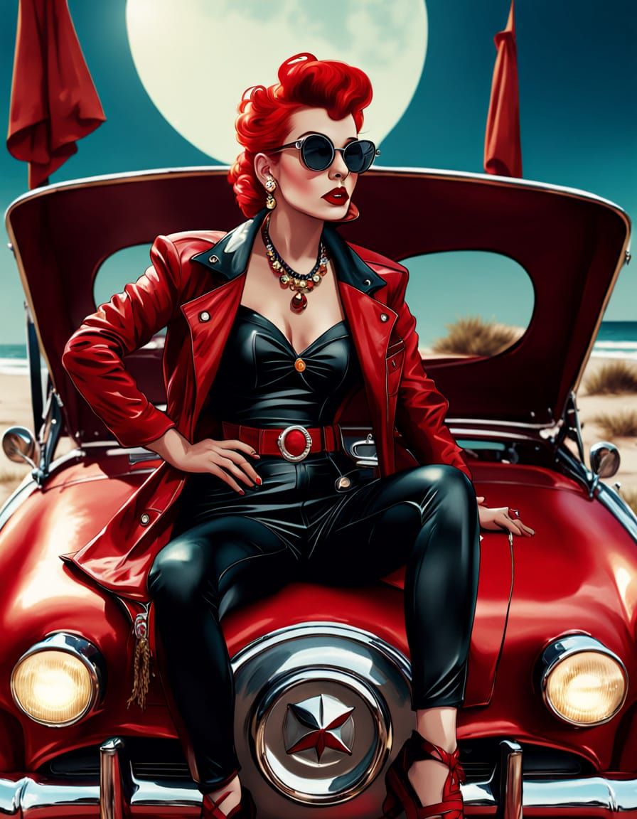 This cinematic film still features a glamorous 1950s pin-up woman in a red dress, leaning on a vintage convertible on a sunny beach. The image evokes a playful mood with golden hour lighting and a retro aesthetic.