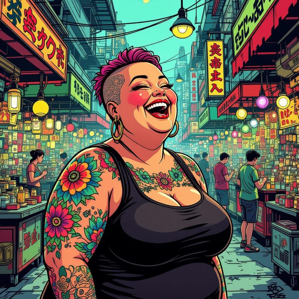 This image shows a cheerful, tattooed woman with a shaved head in a lively, retro-futuristic market. The scene is depicted with bold comic book art styles and vibrant colors.