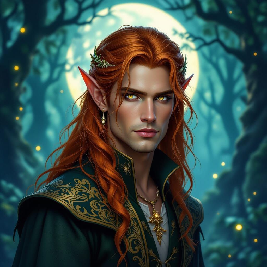 This digital painting depicts a handsome Fae with copper hair and gold eyes in a mystical forest. It features ethereal lighting and ornate elven attire, rendered in a whimsical, Art Nouveau style.