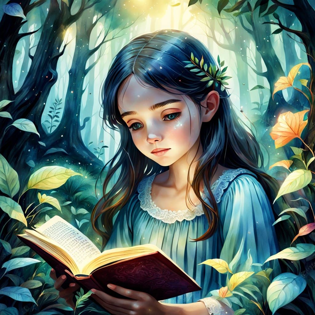 This image shows a girl engrossed in a book amidst a mystical forest. The artwork is rendered in a whimsical watercolor style, featuring delicate brushstrokes and vibrant foliage under soft, warm lighting.