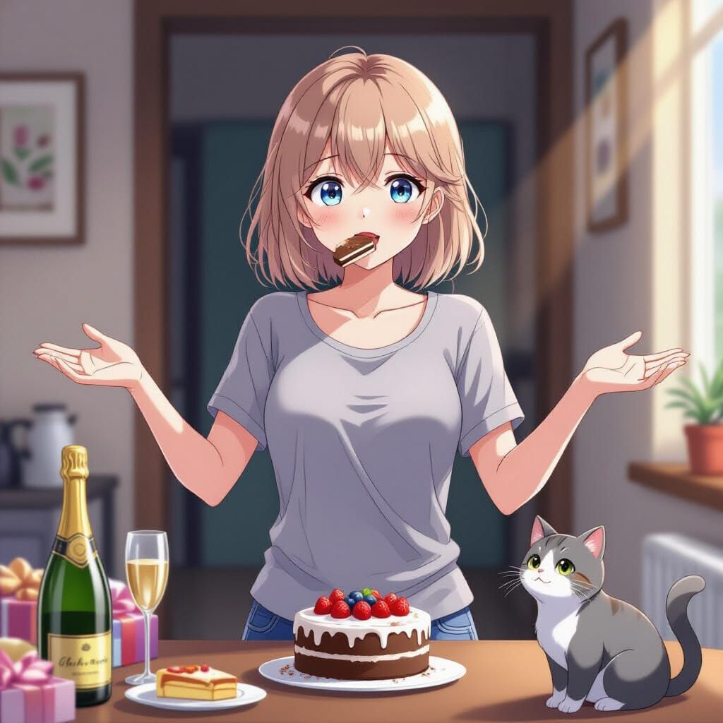 This detailed anime illustration shows a young woman with short blonde hair, surprised with chocolate cake. A cat watches, with champagne and gifts present. Rendered in a flat manga scan style with cel-shading.