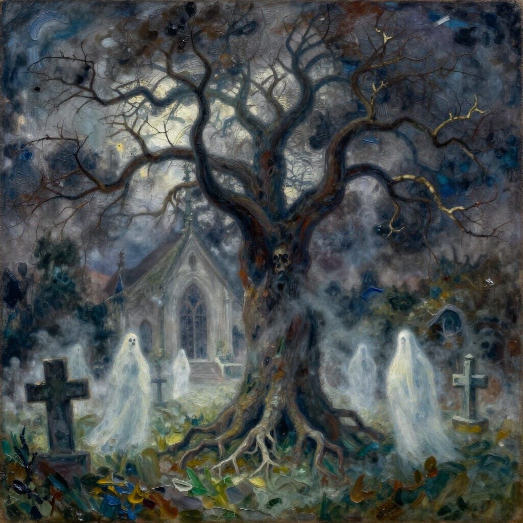 This image depicts a haunted tree with skeletal branches in a misty churchyard, with ghostly figures. Rendered in a thick, impasto gouache and watercolor style with volumetric lighting and cinematic color.