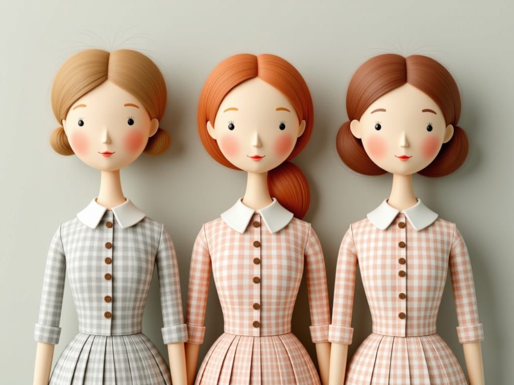 This image features three charming flat paper doll women with round heads, smiling gently. They wear pastel gingham dresses with white collars and button details, rendered in a simple, bright, and whimsical style.