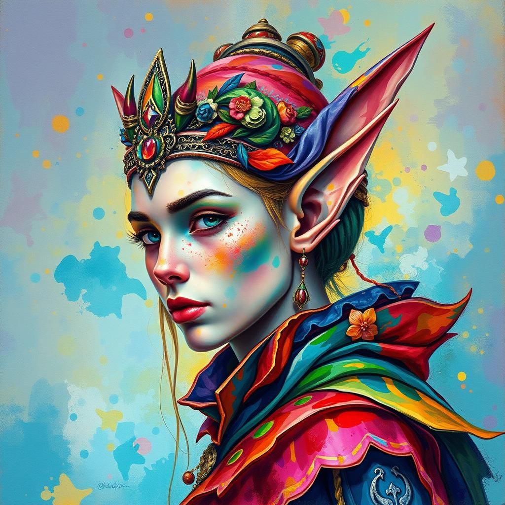 This image shows a vibrant elf with a detailed, colourful costume against a dreamy backdrop. The artwork is reminiscent of 19th-century impressionism, using watercolour, gouache, and impasto techniques.