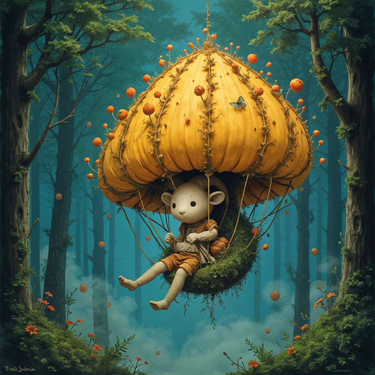 A wondrous creature soars in a hot air balloon at dawn. This image depicts a fantasy scene, blending various artistic techniques to create a magical and ethereal ambiance.