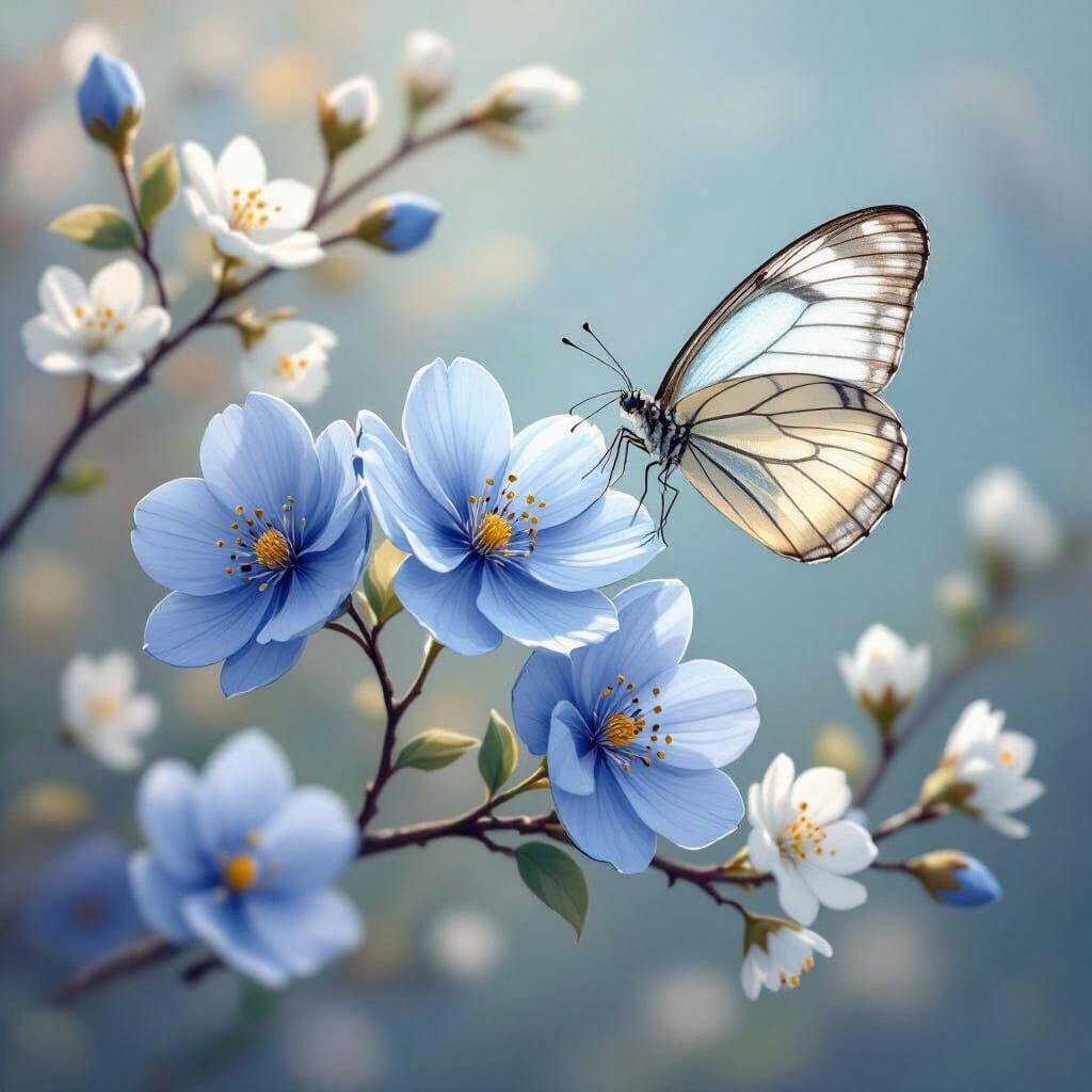 This digital art features delicate blue flowers and a butterfly among white blossoms, bathed in soft, pastel light for a dreamy and serene atmosphere.