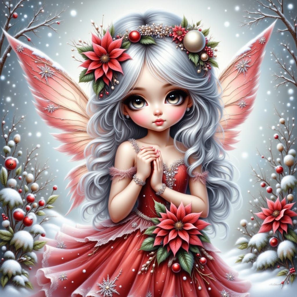 This image shows an adorable fairy with silver hair and expressive eyes, wearing a festive red and silver dress. Delicate wings and a winter scene with poinsettias and holly enhance the magical atmosphere.