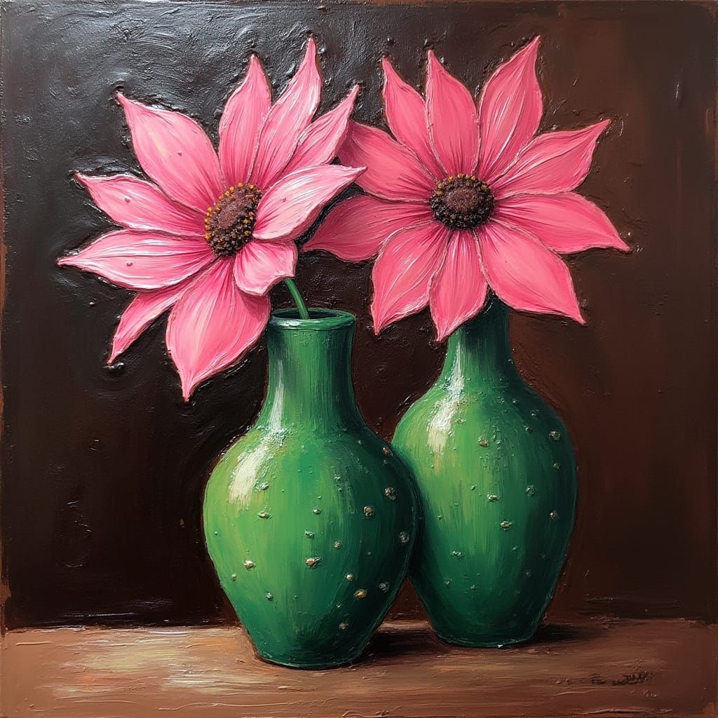 A vibrant abstract floral painting on a dark background. The artwork features a thick, textured surface, rich colors, and dramatic lighting with pink flowers in bright green vases, as impasto art.