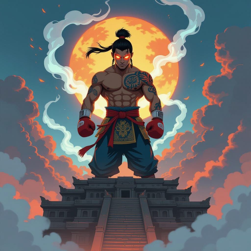 A Muay Thai warrior stands on an ancient ziggurat amidst swirling smoke. The image, rendered in a dynamic anime style, features neon accents and dramatic lighting, evoking traditional Thai art.