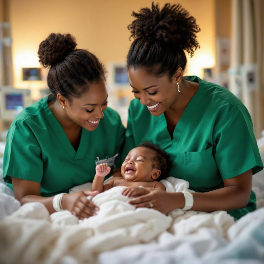A heartwarming scene depicting Black nurses caring for a laughing newborn in a hospital setting. This image features warm lighting, soft textures, and vibrant colors, with an emphasis on intimate expressions.