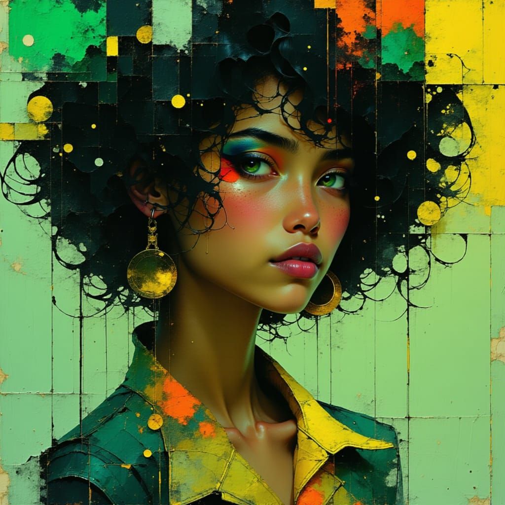A striking picture of an elegant young woman with brown skin and curly black hair, set against an ethereal backdrop with green, teal, and orange accents. The artwork has a dreamlike quality.