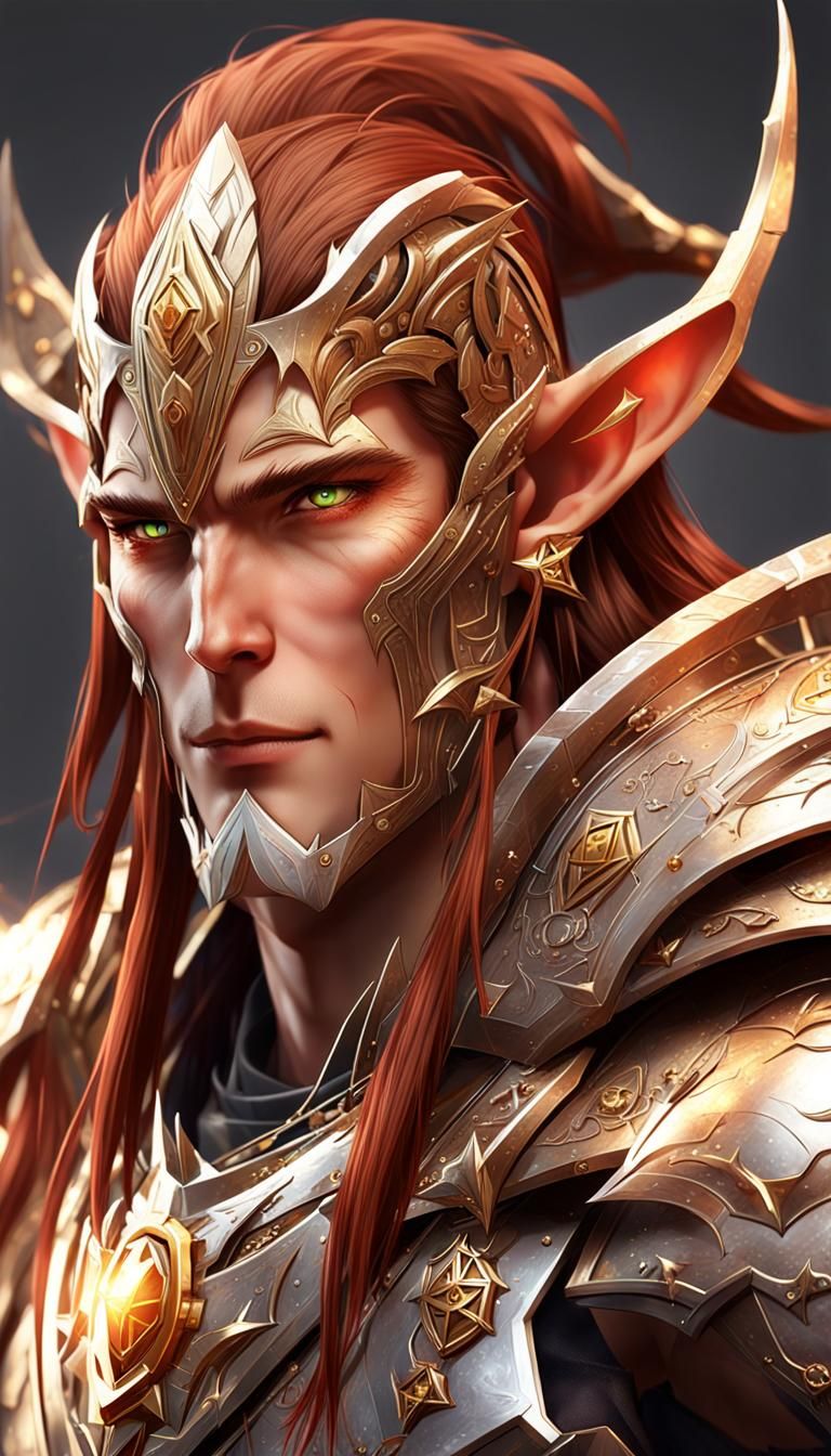 A digital rendering of a handsome, cyborg elf with long reddish-brown hair and pointed ears. One eye is golden metallic, the other red-brown. This 3D anime art is highly detailed and aesthetic.