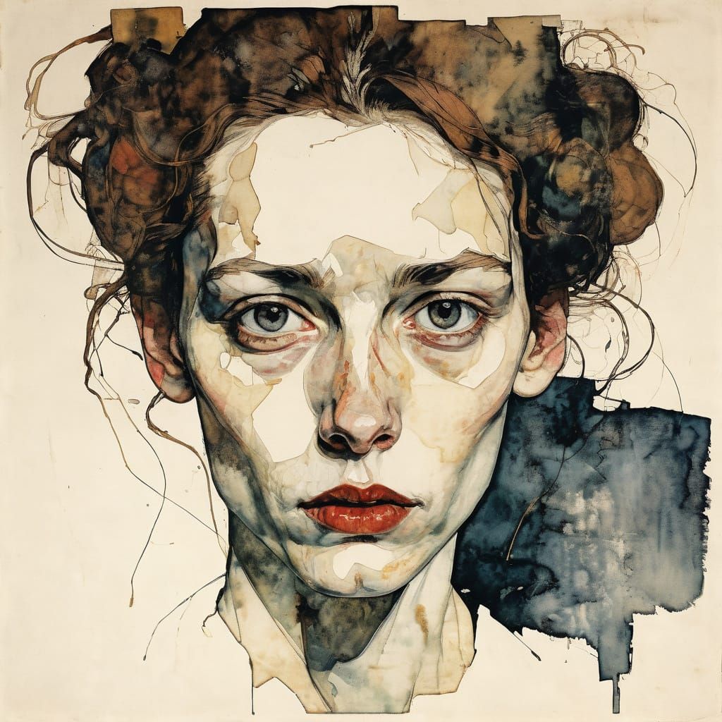 This image shows a hauntingly beautiful woman with a grunge aesthetic, blending elements of Expressionist and Realist styles, set against a muted color palette with bold brushstrokes.