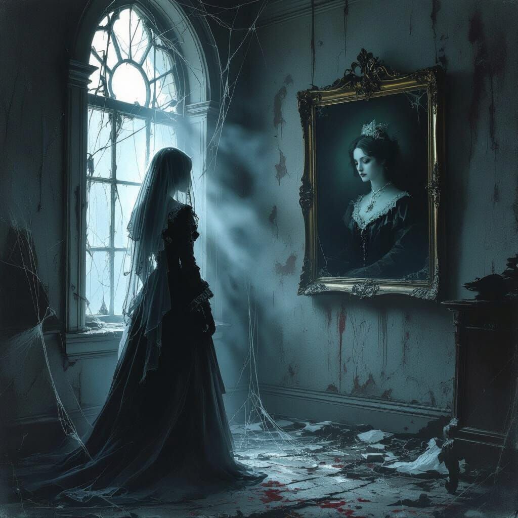 This image shows a spectral figure in Victorian dress contemplating a portrait in a decaying mansion. Moonlight illuminates the scene, rendered with dark surrealism and gothic horror elements in muted grays, blues, and crimson hues.