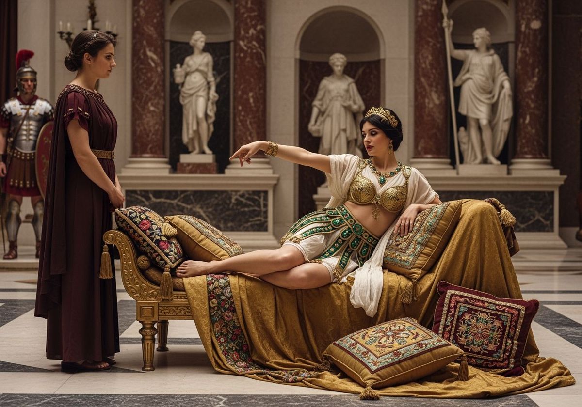 This image shows a Roman Empress in ornate attire lounging on a chaise lounge in her palace. The scene evokes photorealistic artistry and the opulence of ancient Rome.
