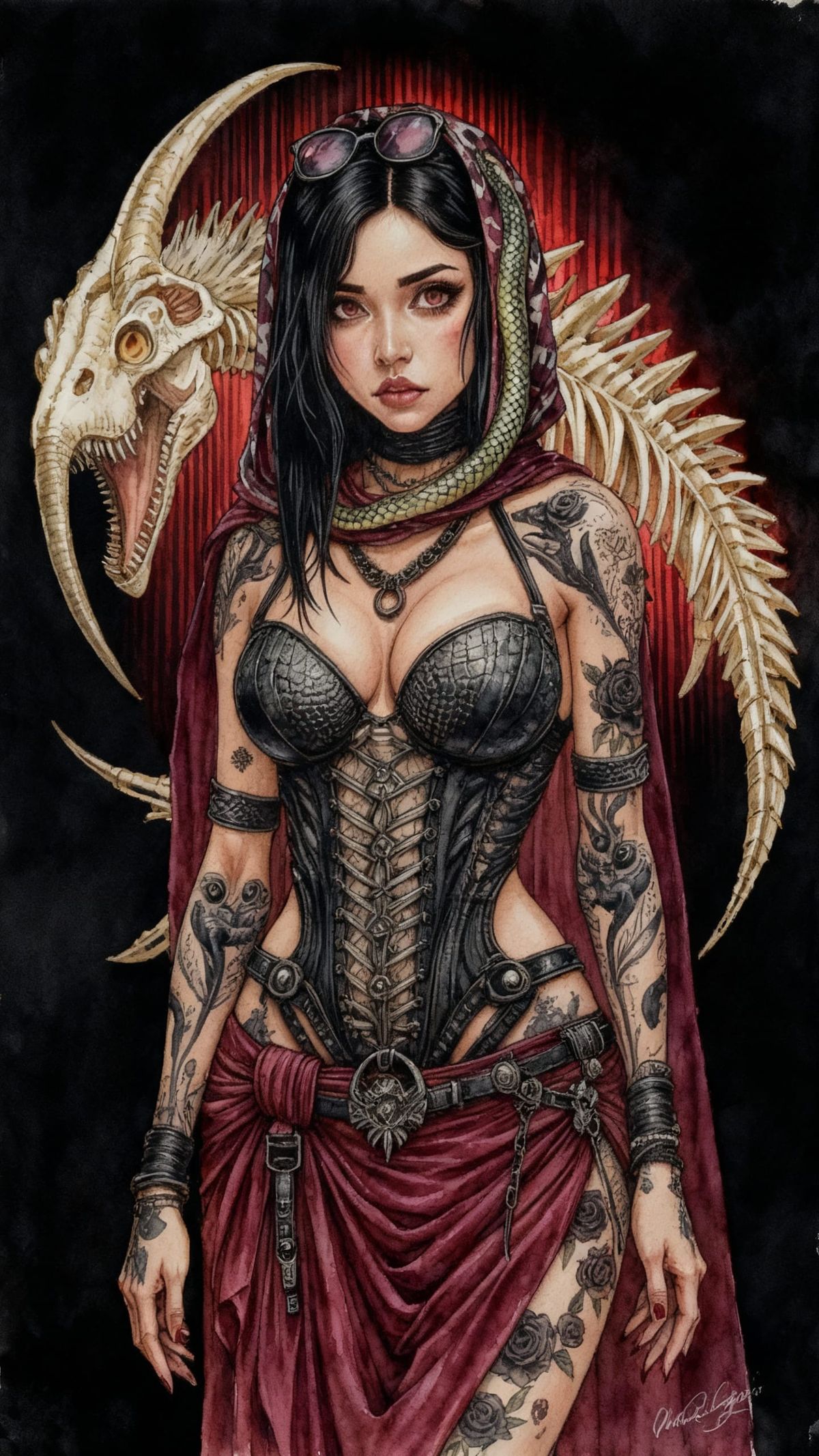 A limited-palette water-colour painting of a young woman (cobra-pattern black/scarlet sari and corset; eel-pattern headscarf; black-rose pattern full-body tattoos) standing in front of a dire-wolf (made of velociraptor bones). Maroon/scarlet striated gradient lighting; intricate details; perfect anatomy; ...