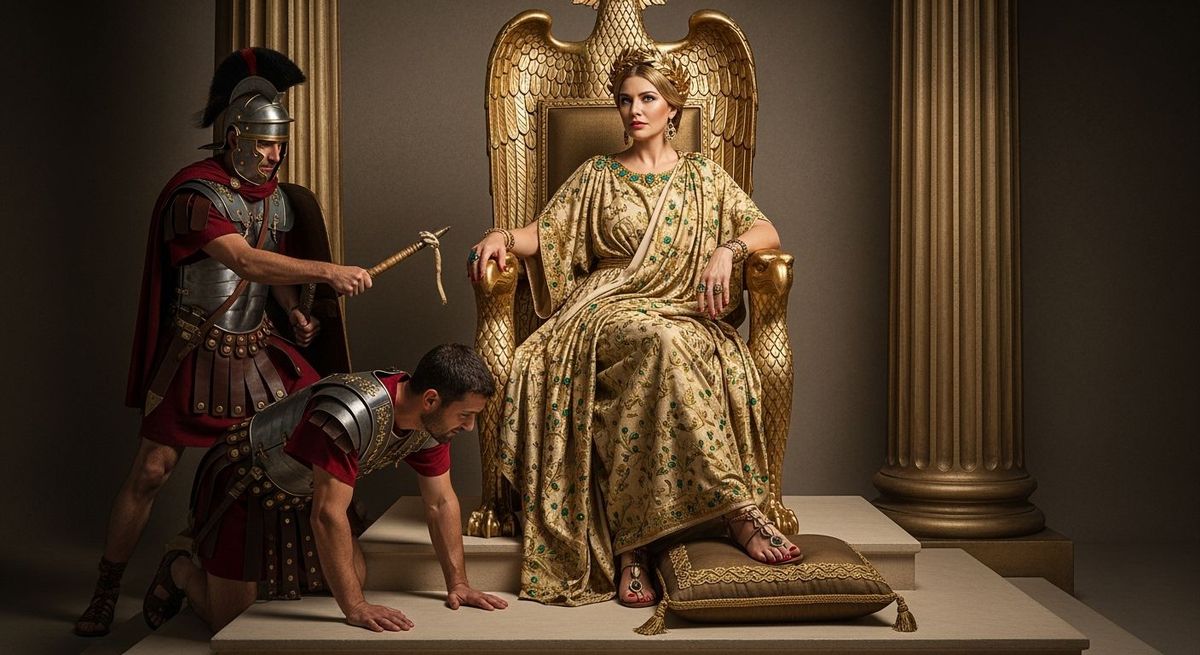 This image shows a Roman Empress on a gold throne, adorned in gold jewelry and a toga. A peasant crawls at her feet as a legionnaire stands nearby. The image is reminiscent of professional portrait photography.