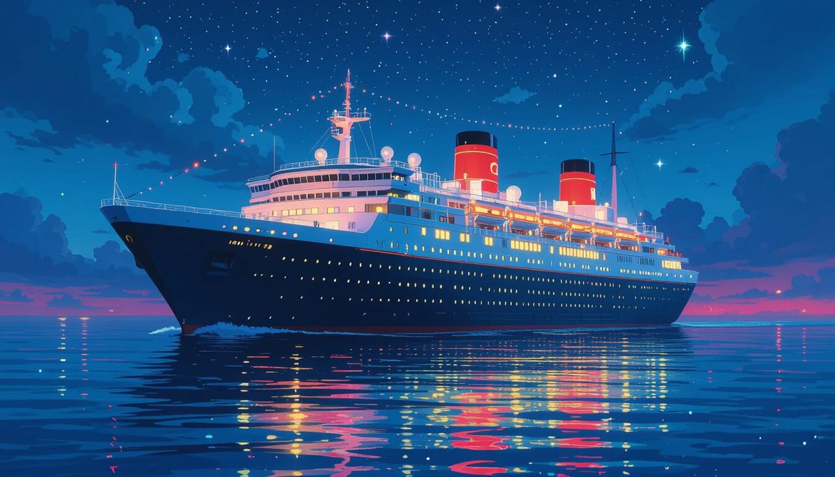 This image shows a cyberpunk ocean liner illuminated with neon lights at night. The vessel is sailing on water that reflects the colorful lights under a starry sky, reminiscent of fantasy concept art.