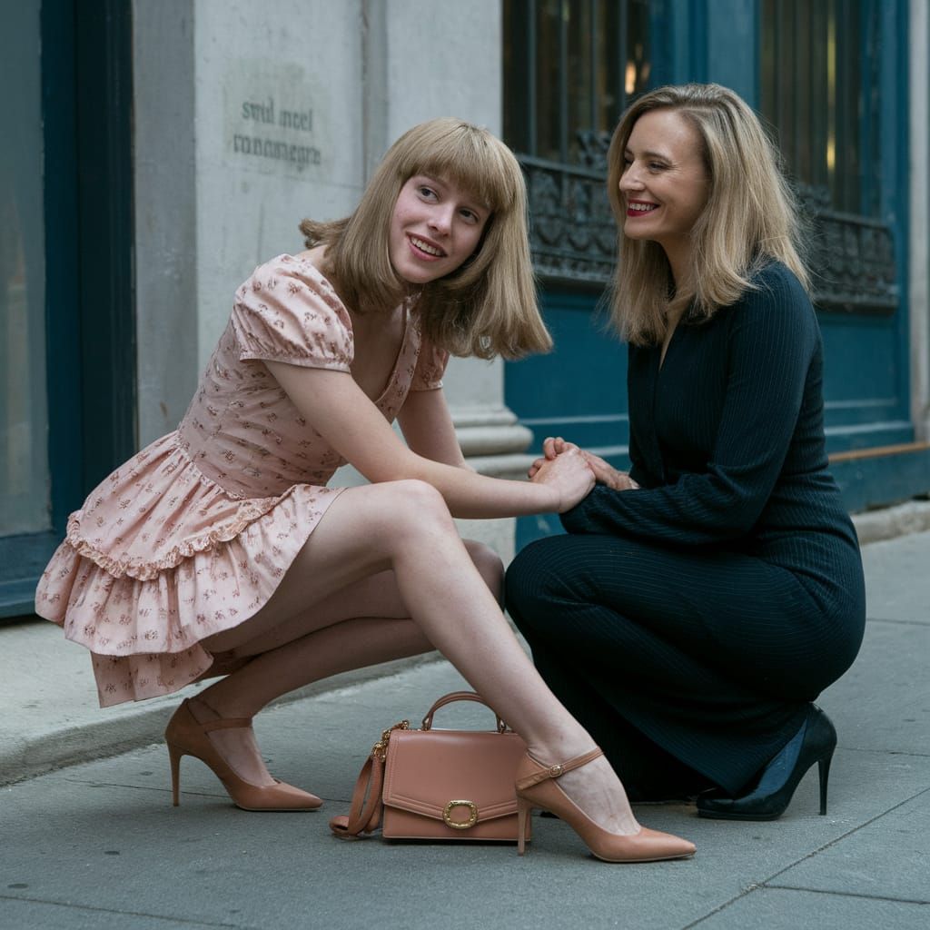A cinematic film still captures an embarrassed young man in a dress and heels falling on a sidewalk, with a woman kneeling to help him. The image features film grain and dramatic lighting.