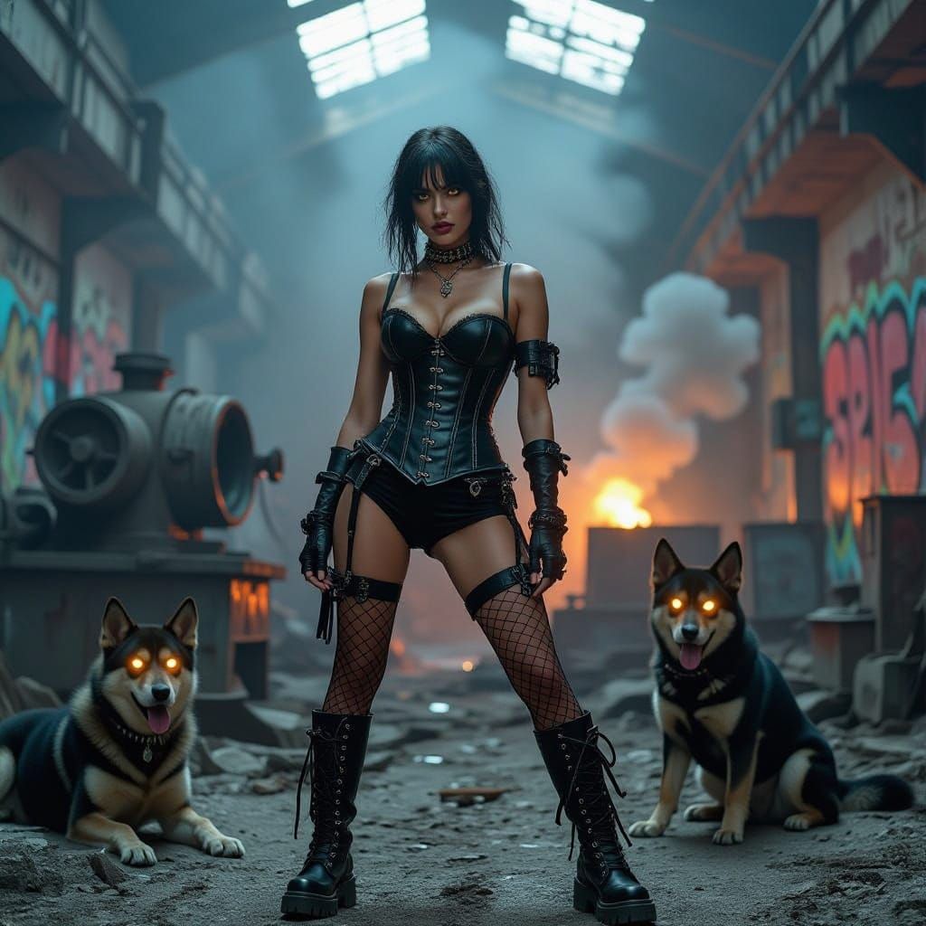 A striking picture of a Neo-Victorian punk fashion model in an industrial art gallery setting. The image features a gritty, high-contrast aesthetic with graffiti street art and moody industrial landscapes.