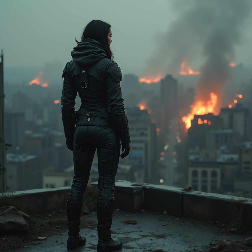 This image depicts a woman in post-apocalyptic armor standing on a dark rooftop, overlooking a smoldering ruined city. The atmosphere is moody and cinematic, with a dark, gritty, and sensual edge.