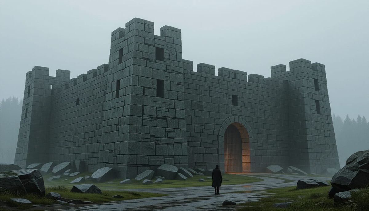 This image shows a large stone wall built with massive, aged stones, evoking a medieval fortress. The artwork features rustic textures and dramatic lighting, as 3D rendered digital art.