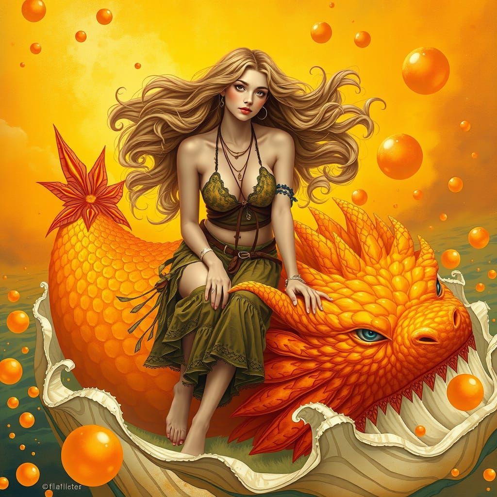 A captivating image of a woman with golden hair riding a giant gummy dragon in a sea of soda. The artwork blends art nouveau elements with imaginative realism and futuristic flair.