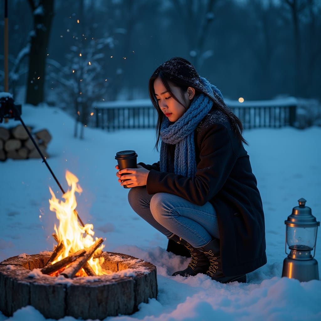 This image shows a woman in a snowy campsite by a campfire, holding a coffee cup. The portrait features a striking warm-cool light contrast and a serene, introspective mood.