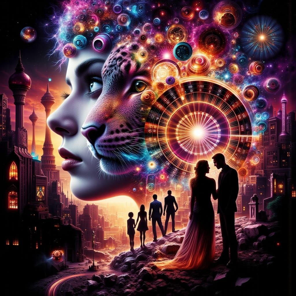 A vibrant double exposure image blending Vegas showgirls and casino elements with a hint of wedding bells, featuring a roaring tiger and roulette wheel.