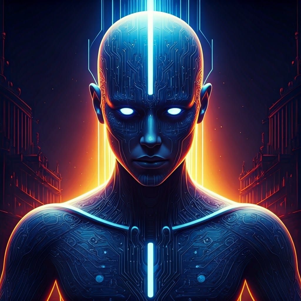 This image depicts a glowing AI entity with swirling circuits and blue veins, set against a vibrant cityscape with ornate architecture. The aesthetic is reminiscent of fantasy concept art in 8k resolution.