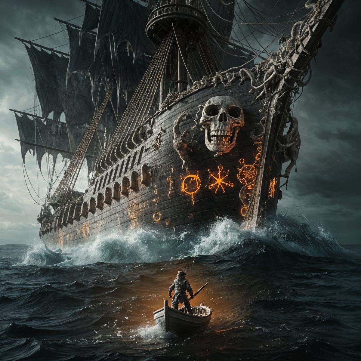 A colossal pirate galleon emerges from the dark ocean, its hull adorned with barnacles and runes. A lone hero in a skiff faces the leviathan in a dramatic, cinematic scene.