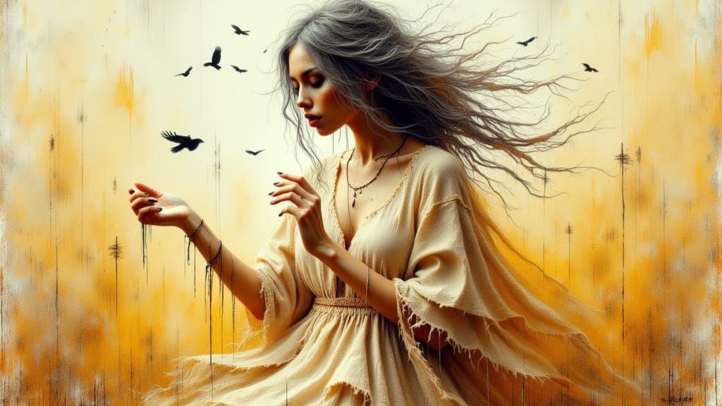 This image depicts an elegant woman with joined hands, immersed in a swirling white and yellow mist, symbolizing positive connection, rendered in a surreal, abstract, and modern artistic style.