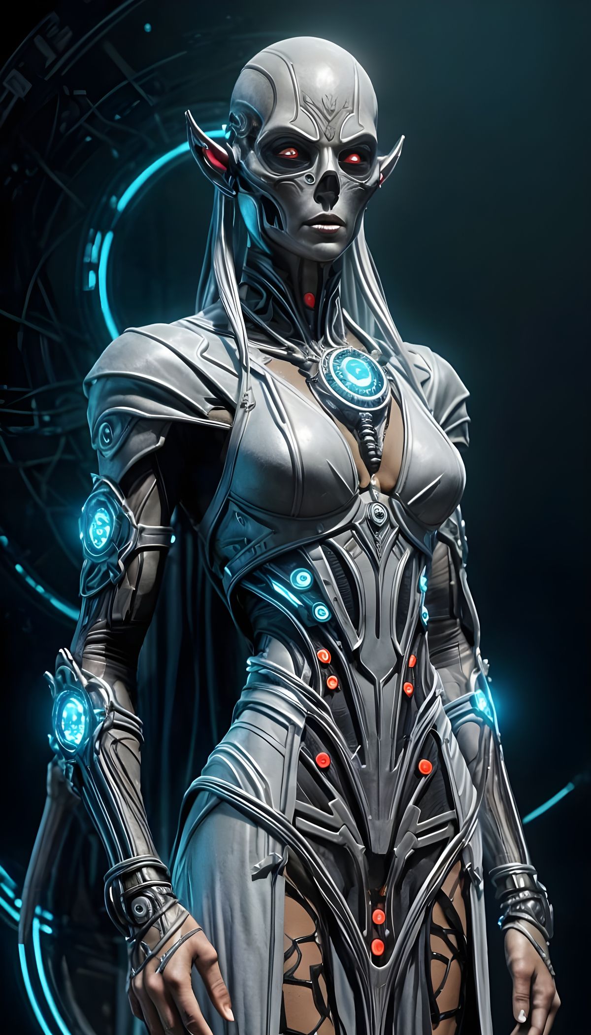 This image shows a stunning, hyper-realistic depiction of an alien woman in a futuristic, intricately designed outfit, set against a dark background, with dynamic lighting and contrasting colors.