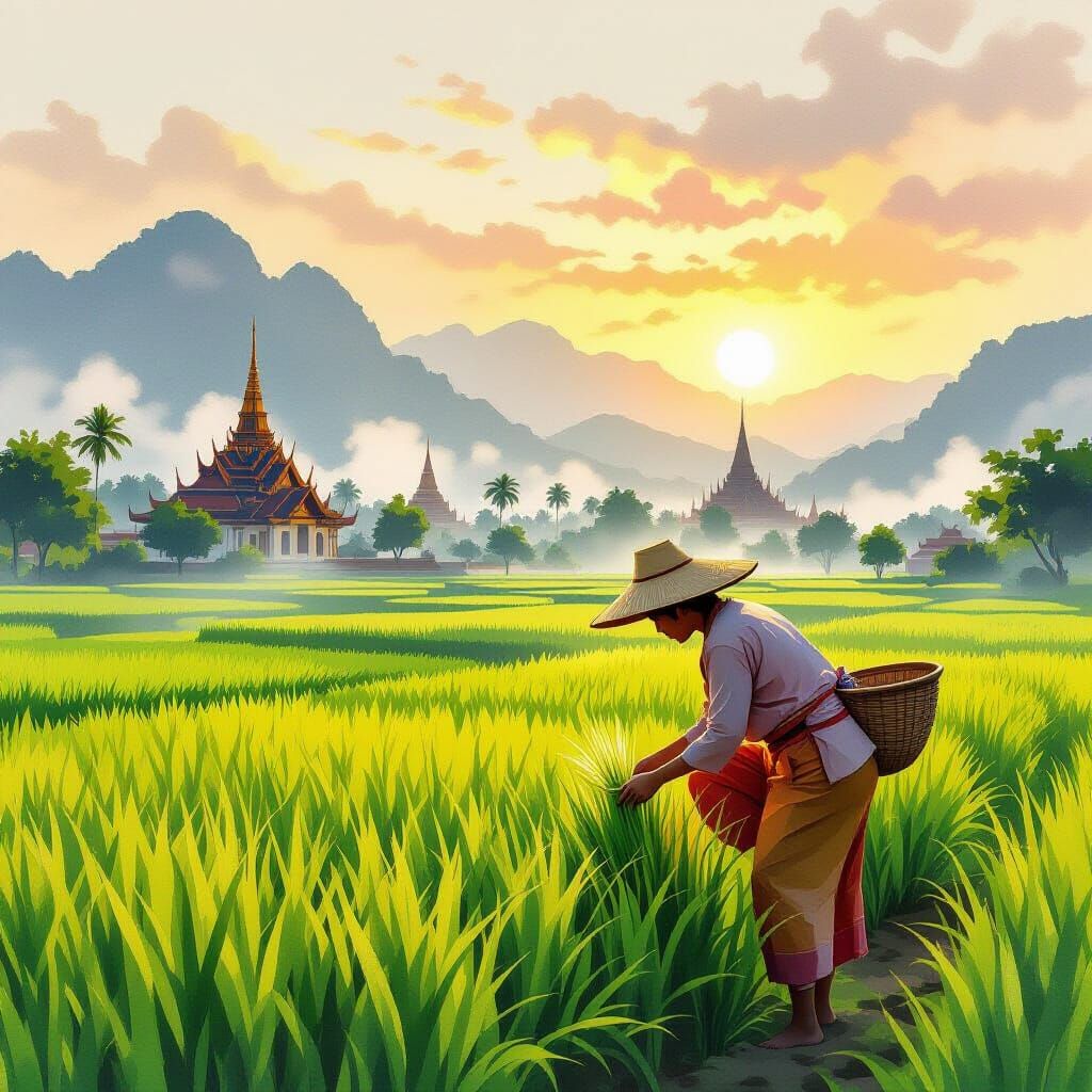 This image shows a rice farmer in Thailand tending his fields as the sun rises. The artwork evokes a fantasy concept art style with dreamy watercolor textures.