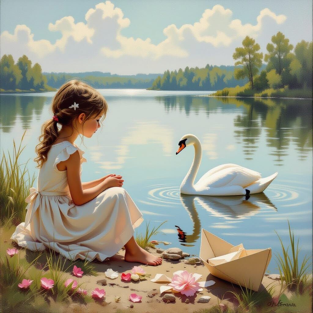 This horizontal oil painting shows a young girl by a lake, watching a swan and a paper boat. Soft pastels and realism with impressionistic touches create a contemplative mood.
