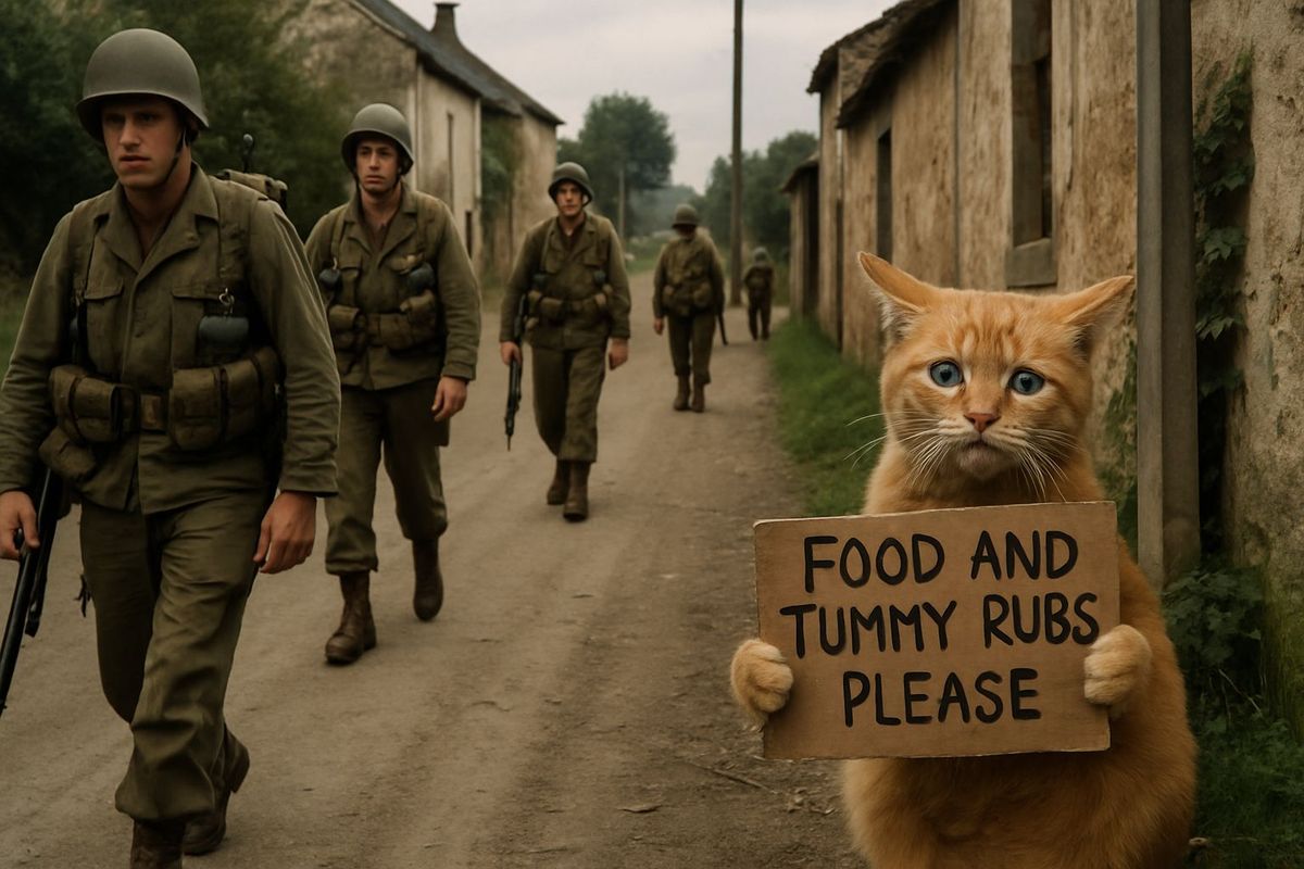 This image shows American GIs walking down a French country road during World War II. A stray orange cat sits roadside with a sign asking for food.